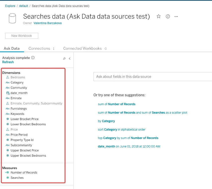 - Tableau pre-analyzes the fields in the data source and suggests sample questions based on the data types. Once the user starts typing their question even more suggestions appear. This is very helpful for users who might be unsure of how to structure the question and what kind of data they can get from the source.