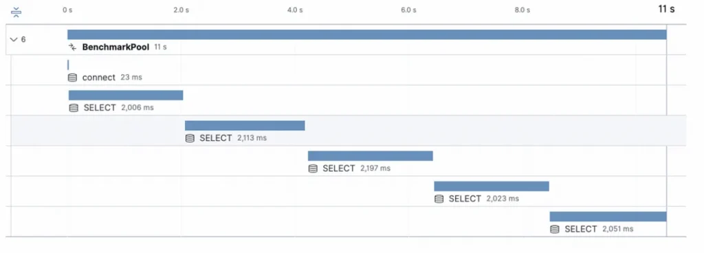 And this will lead us to the situation we talked about above. When each call of our method will block the connection on itself, the rest of the requests will wait until the connection is released. Please note that this takes 11 seconds.
