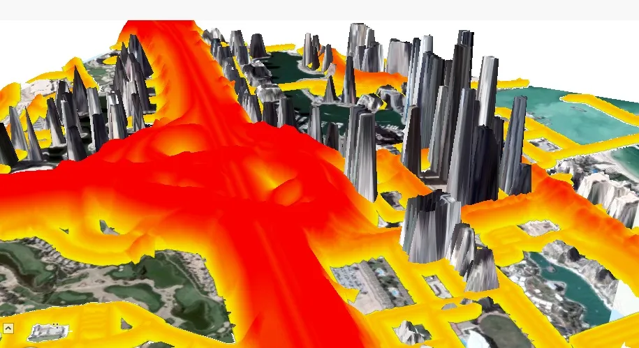 A 3D surface has to be created in GIS in order to model the effect that physical barriers have on the direction and absorption of sound. Within our area of interest, this primarily takes the form of buildings.