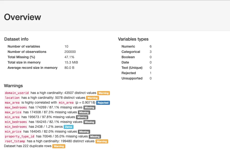 The first part of the pipeline is all about understanding the data. Distribution, data format and missing values are some examples of data profiling tasks. In order to minimize the time of this task we can utilize two Python libraries, pandas and pandas_profiling. For instance, we can use pandas to get the following results: