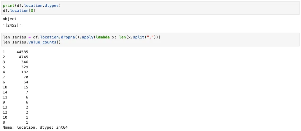 So, by splitting each value based on the number of “,” characters we see that the majority of lists contain a single value but there are records that have lists of more than one value. One way to deal with this is to create n records for the n locations that are contained inside each list, keeping all the other feature values the same and adding the different locations on each record. Of course, you can use pandas for this: