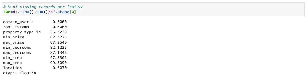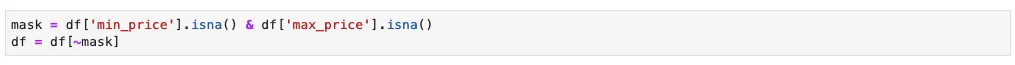 So, by removing these rows we are left with only 698 records! We can still address the features’ missing values later in the process. What we can do now is get rid of the records that do not have at least one of the min/max price variables, since we will use them later to generate the target variable: